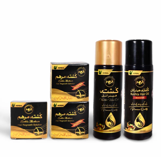 The Kushta Deal by Hakeem Musa is a specially designed 2-month herbal hair treatment course, including Kushta Hair Oil, Kushta Marham, Booster Oil, and Booster Marham. This powerful combination is created to naturally fight male baldness, stop hair loss, and resolve all hair-related issues effectively.